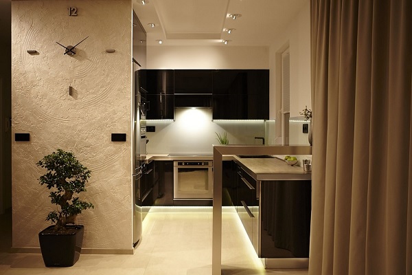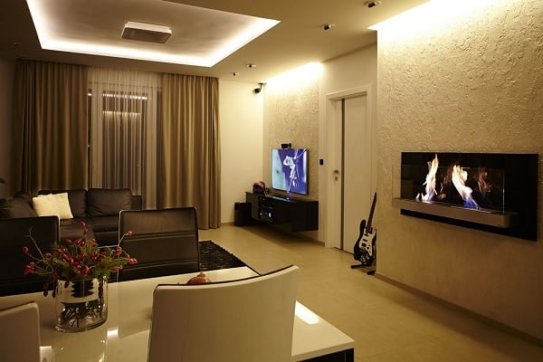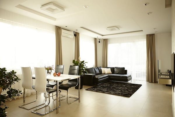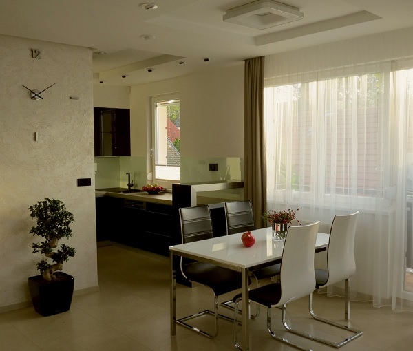 Zona socială a casei, compusă din living, zonă de dining și bucătărie, este concepută ca un spațiu amplu, deschis, tipic modern. Paleta cromatică folosită, bazată pe contrastul dintre alb și negru, este una tipic minimalistă, ce inspiră simplitate și eleganță; nuanțele calde de crem, alături de inserarea unor elemente vii în „peisaj” (plantele decorative, florile și fructele), atenuează sobrietatea întregului decor, conferindu-i prospețime și dinamism. Potrivit cu dorința proprietarului, amenajarea acestui apartament atrage atenția prin câteva elemente originale de design: peretele dinspre bucătărie, finisat în mod deosebit și decorat cu un ceas cu design contemporan, șemineul de pe perete, sistemul modern de iluminare etc.