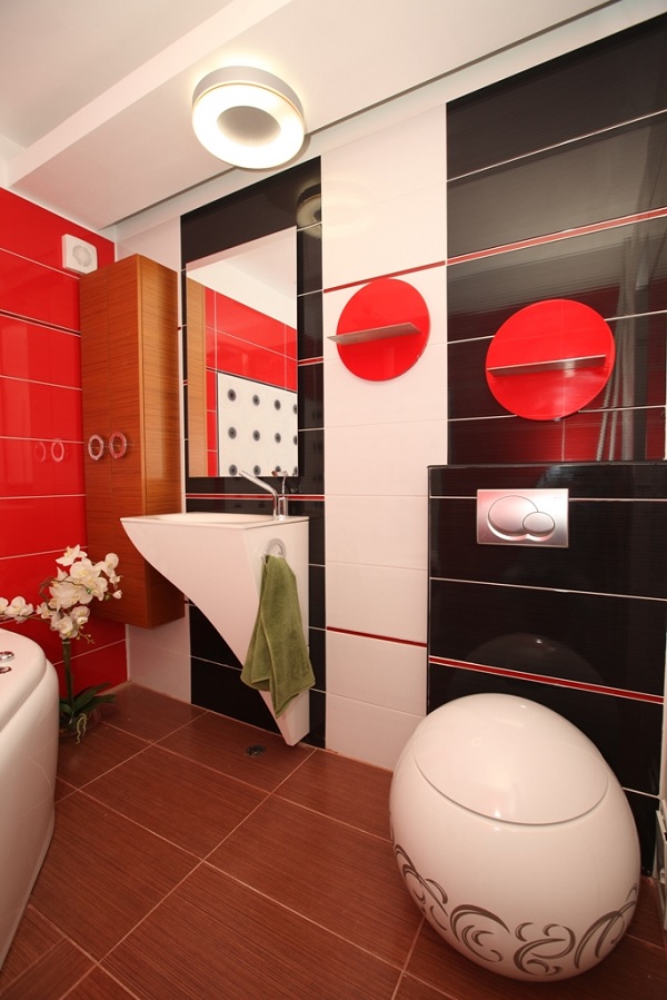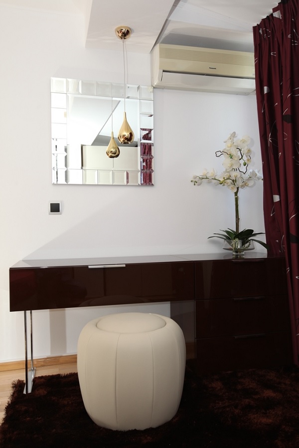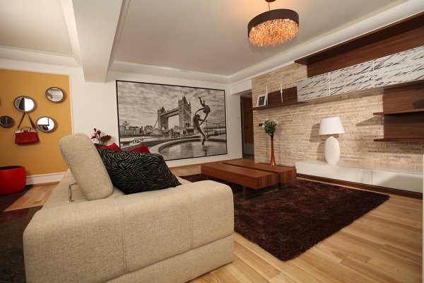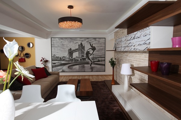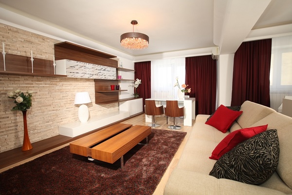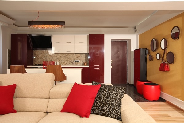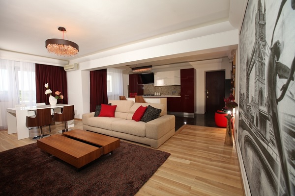 „Acest apartament a fost o adevărată provocare mai ales din cauza dimensiunii reduse, de 60 de metri pătrați”, mărturisesc autorii proiectului. Pentru a valorifica la maximum suprafața disponibilă, conferind totodată o notă modernă unei locuințe compartimentate după tiparul comunist, aceștia au optat pentru eliminarea peretelui despărțitor dintre living și bucătărie, cele două fiind transformate într-un spațiu amplu, deschis. Paleta cromatică aleasă pentru amenajare este una de actualitate, folosind nuanțe din sfera culorilor pământului (diferite tonuri de maro, crem și negru), în combinație cu alb și accente puternice de roșu și grena, ce aduc energie decorului. „Deşi mic, apartamentul are un aer chic conferit de fresca cu tapet pictat din living, element care aduce o notă de contemporaneitate amenajării, dar şi mulţumită corpurilor de iluminat speciale, cu numeroase cristale colorate”, completează designerii.